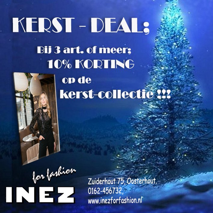 Kerst-deal Inez for Fashion 11 december - 24 december Inez for Fashion Ontvang 10% korting op de kerst-collectie bij 3 artikelen of meer. Lees verder Ontvang 10% korting op de kerst-collectie bij 3 artikelen of meer. Zuiderhout 75, 4904 AV Oosterhout
