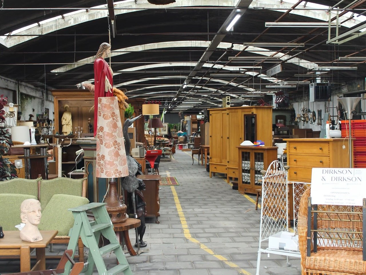 Wie mid-century zoekt, belandt vanzelf bij VintageMeesters. Hun stijl is strak, warm en tijdloos; van jaren ’50 dressoirs tot retro lampen en keramiek. Loop je verder het terrein over, dan valt één plek niet te missen: de imposante loods van Dirkson & Dirkson. Een ruige schatkamer vol antiek, Perzische tapijten, kasten, spiegels, curiosa en vondsten die je nergens anders ziet. Hier kun je verdwalen — op de goede manier.